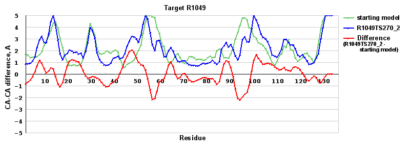 | Red line = (blue line) - (green thick line): difference between the corresponding Refined Model-Target and Starting Model-Target CA-CA distances (see above). Negative values show regions where the reifned model has better fit to the target than the starting model, i.e. areas of potential improvement. |