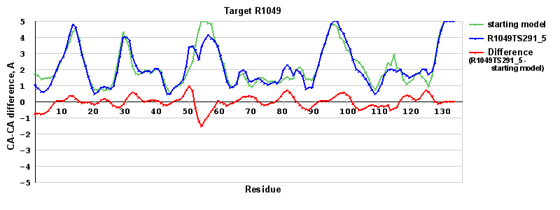 | Red line = (blue line) - (green thick line): difference between the corresponding Refined Model-Target and Starting Model-Target CA-CA distances (see above). Negative values show regions where the reifned model has better fit to the target than the starting model, i.e. areas of potential improvement. |