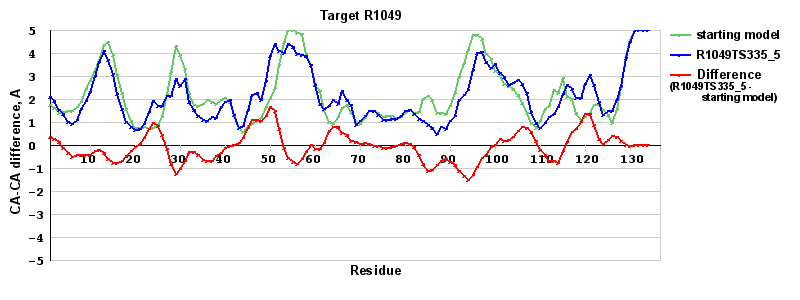 | Red line = (blue line) - (green thick line): difference between the corresponding Refined Model-Target and Starting Model-Target CA-CA distances (see above). Negative values show regions where the reifned model has better fit to the target than the starting model, i.e. areas of potential improvement. |