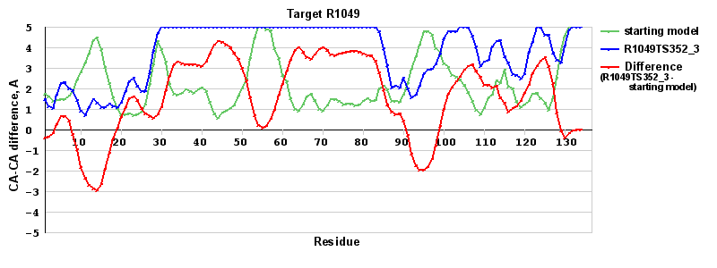 | Red line = (blue line) - (green thick line): difference between the corresponding Refined Model-Target and Starting Model-Target CA-CA distances (see above). Negative values show regions where the reifned model has better fit to the target than the starting model, i.e. areas of potential improvement. |