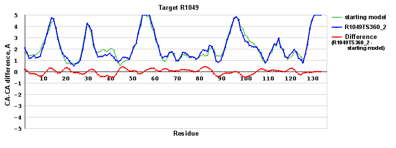 | Red line = (blue line) - (green thick line): difference between the corresponding Refined Model-Target and Starting Model-Target CA-CA distances (see above). Negative values show regions where the reifned model has better fit to the target than the starting model, i.e. areas of potential improvement. |