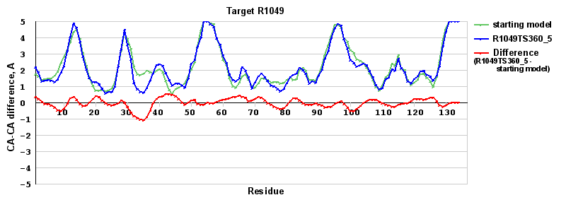 | Red line = (blue line) - (green thick line): difference between the corresponding Refined Model-Target and Starting Model-Target CA-CA distances (see above). Negative values show regions where the reifned model has better fit to the target than the starting model, i.e. areas of potential improvement. |