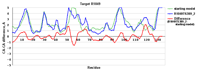| Red line = (blue line) - (green thick line): difference between the corresponding Refined Model-Target and Starting Model-Target CA-CA distances (see above). Negative values show regions where the reifned model has better fit to the target than the starting model, i.e. areas of potential improvement. |