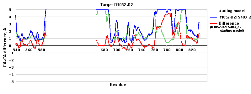 | Red line = (blue line) - (green thick line): difference between the corresponding Refined Model-Target and Starting Model-Target CA-CA distances (see above). Negative values show regions where the reifned model has better fit to the target than the starting model, i.e. areas of potential improvement. |
