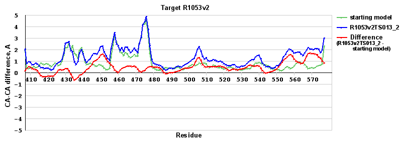 | Red line = (blue line) - (green thick line): difference between the corresponding Refined Model-Target and Starting Model-Target CA-CA distances (see above). Negative values show regions where the reifned model has better fit to the target than the starting model, i.e. areas of potential improvement. |