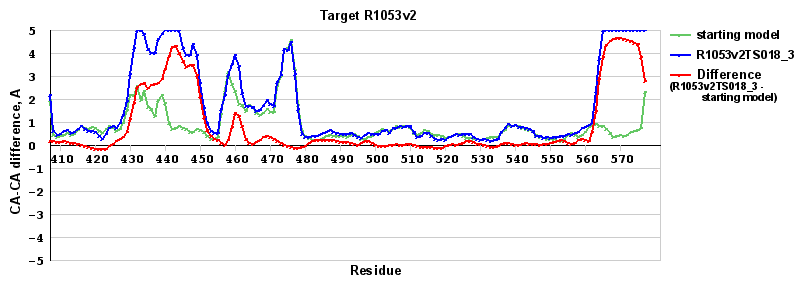 | Red line = (blue line) - (green thick line): difference between the corresponding Refined Model-Target and Starting Model-Target CA-CA distances (see above). Negative values show regions where the reifned model has better fit to the target than the starting model, i.e. areas of potential improvement. |