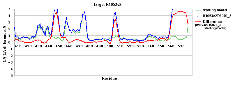 | Red line = (blue line) - (green thick line): difference between the corresponding Refined Model-Target and Starting Model-Target CA-CA distances (see above). Negative values show regions where the reifned model has better fit to the target than the starting model, i.e. areas of potential improvement. |