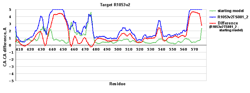 | Red line = (blue line) - (green thick line): difference between the corresponding Refined Model-Target and Starting Model-Target CA-CA distances (see above). Negative values show regions where the reifned model has better fit to the target than the starting model, i.e. areas of potential improvement. |