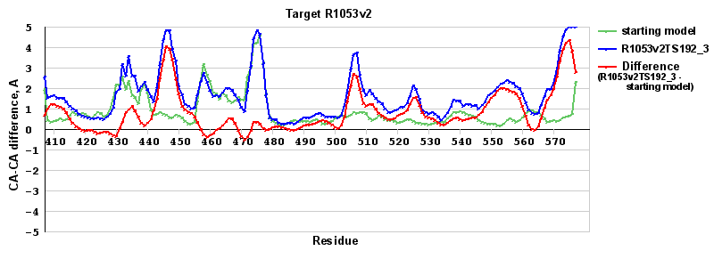 | Red line = (blue line) - (green thick line): difference between the corresponding Refined Model-Target and Starting Model-Target CA-CA distances (see above). Negative values show regions where the reifned model has better fit to the target than the starting model, i.e. areas of potential improvement. |
