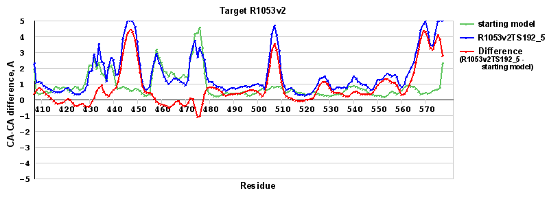 | Red line = (blue line) - (green thick line): difference between the corresponding Refined Model-Target and Starting Model-Target CA-CA distances (see above). Negative values show regions where the reifned model has better fit to the target than the starting model, i.e. areas of potential improvement. |