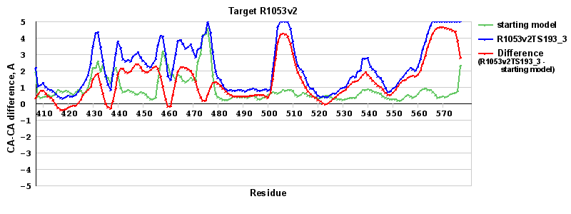 | Red line = (blue line) - (green thick line): difference between the corresponding Refined Model-Target and Starting Model-Target CA-CA distances (see above). Negative values show regions where the reifned model has better fit to the target than the starting model, i.e. areas of potential improvement. |