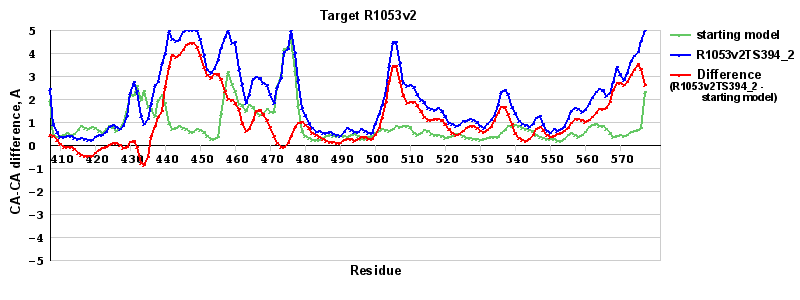 | Red line = (blue line) - (green thick line): difference between the corresponding Refined Model-Target and Starting Model-Target CA-CA distances (see above). Negative values show regions where the reifned model has better fit to the target than the starting model, i.e. areas of potential improvement. |