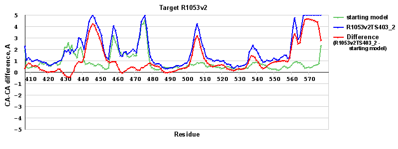 | Red line = (blue line) - (green thick line): difference between the corresponding Refined Model-Target and Starting Model-Target CA-CA distances (see above). Negative values show regions where the reifned model has better fit to the target than the starting model, i.e. areas of potential improvement. |