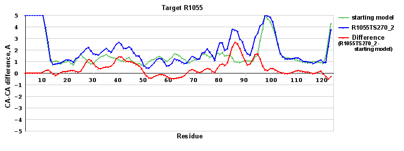 | Red line = (blue line) - (green thick line): difference between the corresponding Refined Model-Target and Starting Model-Target CA-CA distances (see above). Negative values show regions where the reifned model has better fit to the target than the starting model, i.e. areas of potential improvement. |