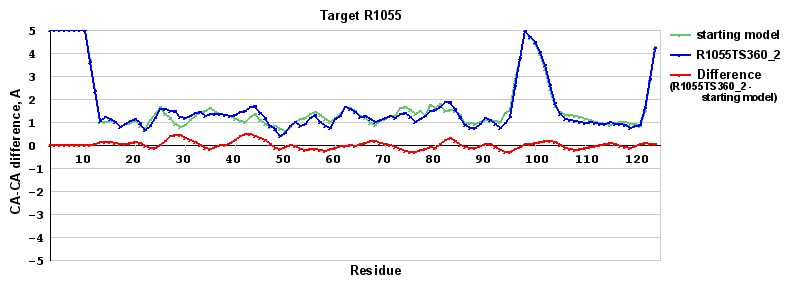 | Red line = (blue line) - (green thick line): difference between the corresponding Refined Model-Target and Starting Model-Target CA-CA distances (see above). Negative values show regions where the reifned model has better fit to the target than the starting model, i.e. areas of potential improvement. |