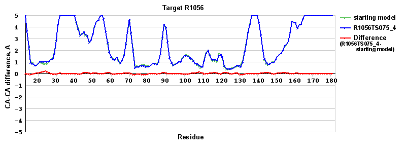 | Red line = (blue line) - (green thick line): difference between the corresponding Refined Model-Target and Starting Model-Target CA-CA distances (see above). Negative values show regions where the reifned model has better fit to the target than the starting model, i.e. areas of potential improvement. |