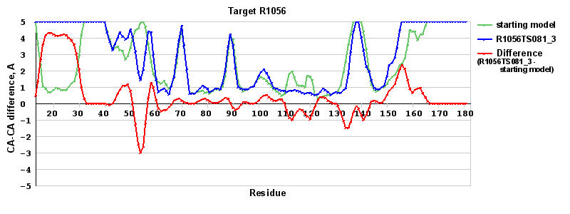| Red line = (blue line) - (green thick line): difference between the corresponding Refined Model-Target and Starting Model-Target CA-CA distances (see above). Negative values show regions where the reifned model has better fit to the target than the starting model, i.e. areas of potential improvement. |