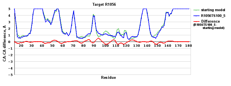 | Red line = (blue line) - (green thick line): difference between the corresponding Refined Model-Target and Starting Model-Target CA-CA distances (see above). Negative values show regions where the reifned model has better fit to the target than the starting model, i.e. areas of potential improvement. |