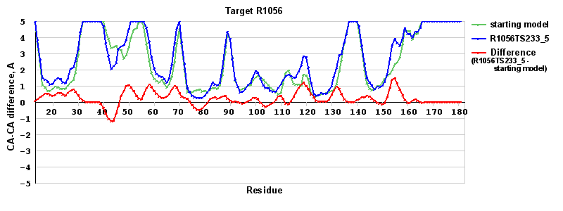 | Red line = (blue line) - (green thick line): difference between the corresponding Refined Model-Target and Starting Model-Target CA-CA distances (see above). Negative values show regions where the reifned model has better fit to the target than the starting model, i.e. areas of potential improvement. |