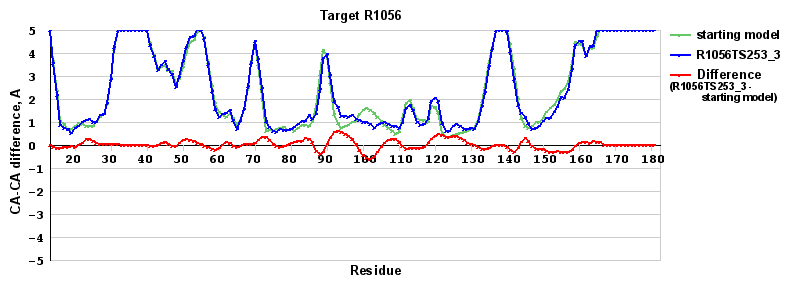 | Red line = (blue line) - (green thick line): difference between the corresponding Refined Model-Target and Starting Model-Target CA-CA distances (see above). Negative values show regions where the reifned model has better fit to the target than the starting model, i.e. areas of potential improvement. |