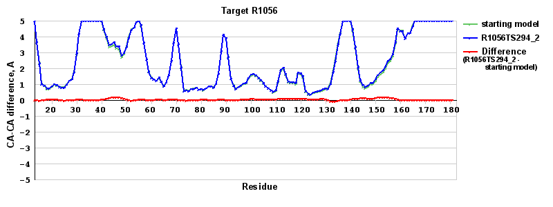 | Red line = (blue line) - (green thick line): difference between the corresponding Refined Model-Target and Starting Model-Target CA-CA distances (see above). Negative values show regions where the reifned model has better fit to the target than the starting model, i.e. areas of potential improvement. |
