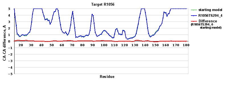 | Green line: distance between the aligned CA atoms in the starting model and the experimental structure in the LGA sequence-independent superposition under the 4A distance cutoff (see LGA description). |