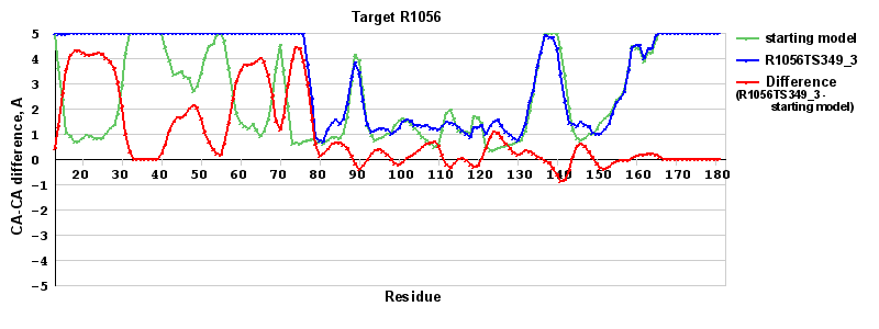 | Red line = (blue line) - (green thick line): difference between the corresponding Refined Model-Target and Starting Model-Target CA-CA distances (see above). Negative values show regions where the reifned model has better fit to the target than the starting model, i.e. areas of potential improvement. |