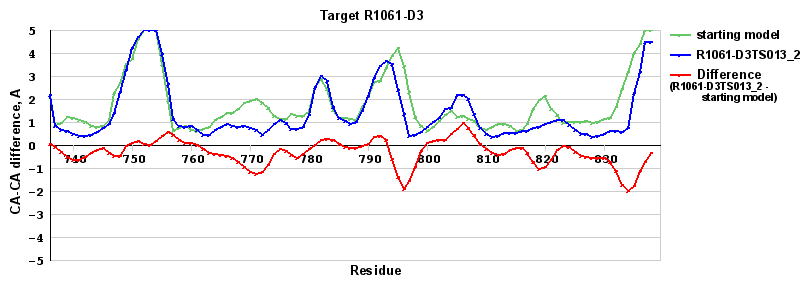 | Red line = (blue line) - (green thick line): difference between the corresponding Refined Model-Target and Starting Model-Target CA-CA distances (see above). Negative values show regions where the reifned model has better fit to the target than the starting model, i.e. areas of potential improvement. |