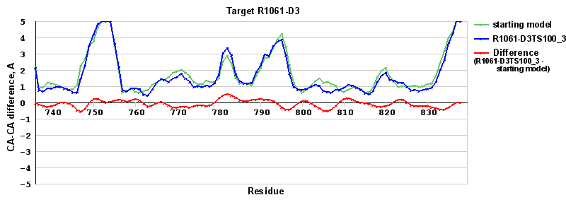 | Red line = (blue line) - (green thick line): difference between the corresponding Refined Model-Target and Starting Model-Target CA-CA distances (see above). Negative values show regions where the reifned model has better fit to the target than the starting model, i.e. areas of potential improvement. |