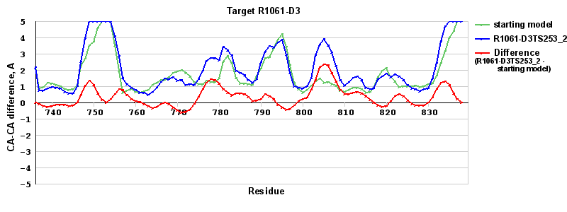 | Red line = (blue line) - (green thick line): difference between the corresponding Refined Model-Target and Starting Model-Target CA-CA distances (see above). Negative values show regions where the reifned model has better fit to the target than the starting model, i.e. areas of potential improvement. |