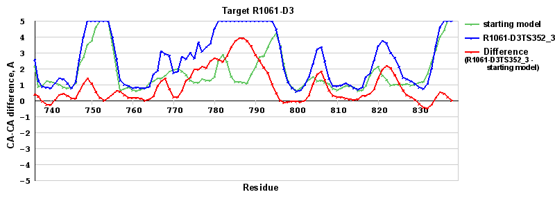 | Red line = (blue line) - (green thick line): difference between the corresponding Refined Model-Target and Starting Model-Target CA-CA distances (see above). Negative values show regions where the reifned model has better fit to the target than the starting model, i.e. areas of potential improvement. |