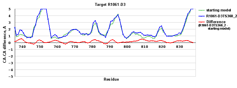 | Red line = (blue line) - (green thick line): difference between the corresponding Refined Model-Target and Starting Model-Target CA-CA distances (see above). Negative values show regions where the reifned model has better fit to the target than the starting model, i.e. areas of potential improvement. |