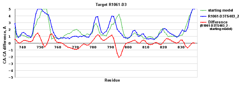 | Red line = (blue line) - (green thick line): difference between the corresponding Refined Model-Target and Starting Model-Target CA-CA distances (see above). Negative values show regions where the reifned model has better fit to the target than the starting model, i.e. areas of potential improvement. |