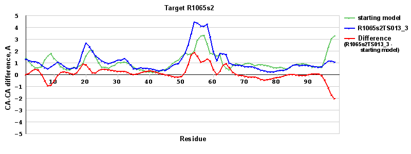 | Red line = (blue line) - (green thick line): difference between the corresponding Refined Model-Target and Starting Model-Target CA-CA distances (see above). Negative values show regions where the reifned model has better fit to the target than the starting model, i.e. areas of potential improvement. |