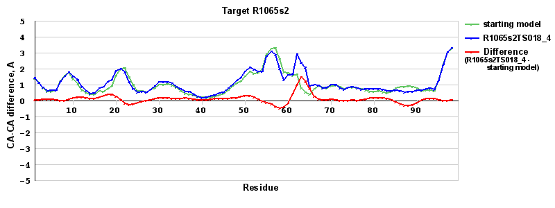 | Green line: distance between the aligned CA atoms in the starting model and the experimental structure in the LGA sequence-independent superposition under the 4A distance cutoff (see LGA description). |