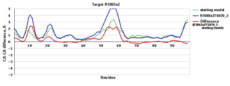 | Red line = (blue line) - (green thick line): difference between the corresponding Refined Model-Target and Starting Model-Target CA-CA distances (see above). Negative values show regions where the reifned model has better fit to the target than the starting model, i.e. areas of potential improvement. |