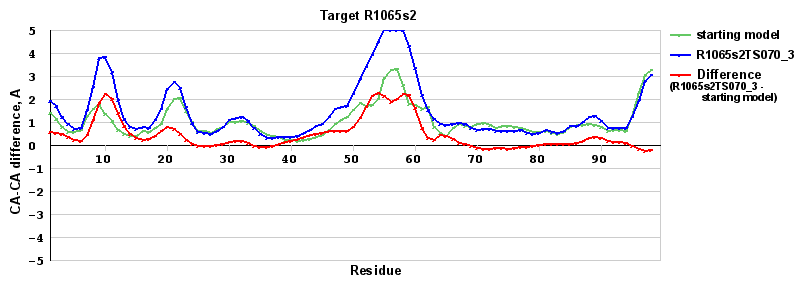 | Red line = (blue line) - (green thick line): difference between the corresponding Refined Model-Target and Starting Model-Target CA-CA distances (see above). Negative values show regions where the reifned model has better fit to the target than the starting model, i.e. areas of potential improvement. |