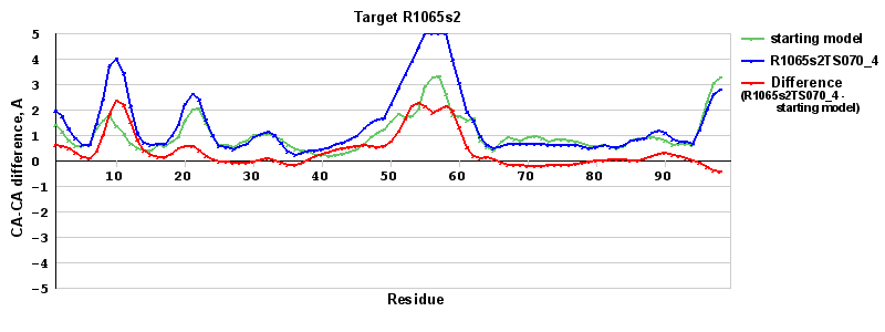 | Red line = (blue line) - (green thick line): difference between the corresponding Refined Model-Target and Starting Model-Target CA-CA distances (see above). Negative values show regions where the reifned model has better fit to the target than the starting model, i.e. areas of potential improvement. |