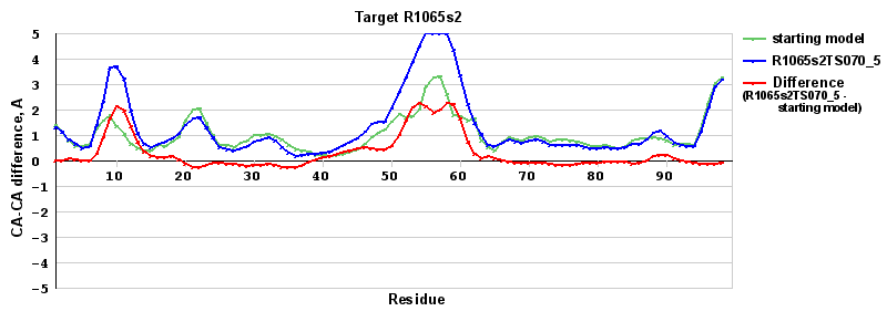 | Red line = (blue line) - (green thick line): difference between the corresponding Refined Model-Target and Starting Model-Target CA-CA distances (see above). Negative values show regions where the reifned model has better fit to the target than the starting model, i.e. areas of potential improvement. |
