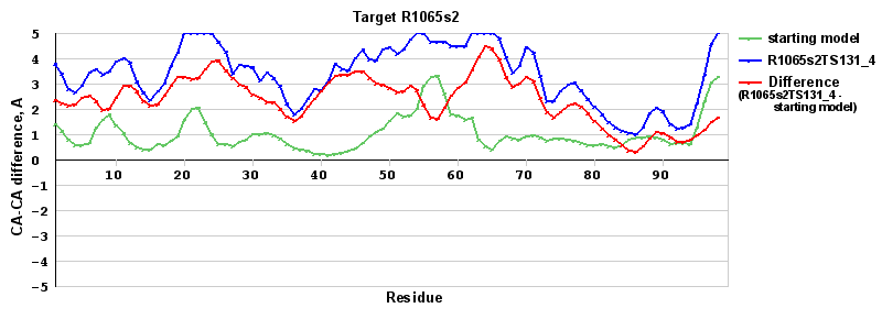 | Green line: distance between the aligned CA atoms in the starting model and the experimental structure in the LGA sequence-independent superposition under the 4A distance cutoff (see LGA description). |