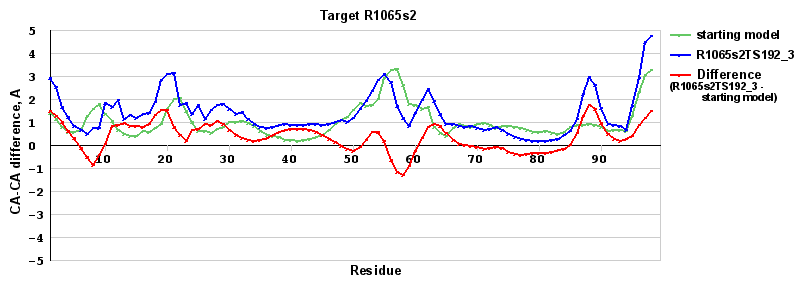 | Red line = (blue line) - (green thick line): difference between the corresponding Refined Model-Target and Starting Model-Target CA-CA distances (see above). Negative values show regions where the reifned model has better fit to the target than the starting model, i.e. areas of potential improvement. |
