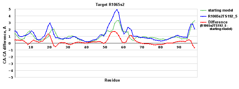 | Red line = (blue line) - (green thick line): difference between the corresponding Refined Model-Target and Starting Model-Target CA-CA distances (see above). Negative values show regions where the reifned model has better fit to the target than the starting model, i.e. areas of potential improvement. |
