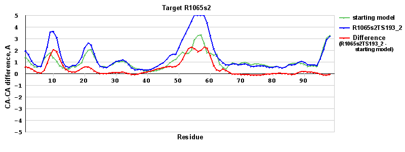 | Red line = (blue line) - (green thick line): difference between the corresponding Refined Model-Target and Starting Model-Target CA-CA distances (see above). Negative values show regions where the reifned model has better fit to the target than the starting model, i.e. areas of potential improvement. |