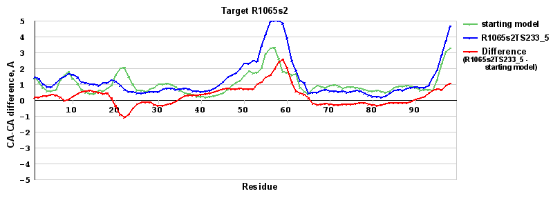 | Red line = (blue line) - (green thick line): difference between the corresponding Refined Model-Target and Starting Model-Target CA-CA distances (see above). Negative values show regions where the reifned model has better fit to the target than the starting model, i.e. areas of potential improvement. |
