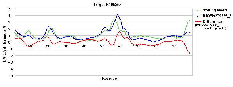 | Red line = (blue line) - (green thick line): difference between the corresponding Refined Model-Target and Starting Model-Target CA-CA distances (see above). Negative values show regions where the reifned model has better fit to the target than the starting model, i.e. areas of potential improvement. |