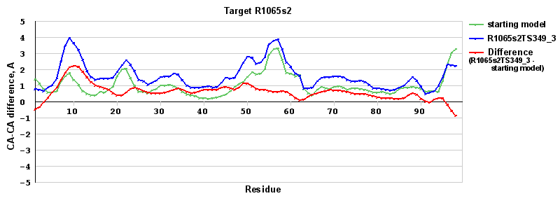 | Red line = (blue line) - (green thick line): difference between the corresponding Refined Model-Target and Starting Model-Target CA-CA distances (see above). Negative values show regions where the reifned model has better fit to the target than the starting model, i.e. areas of potential improvement. |