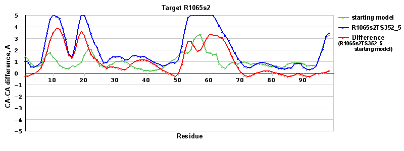 | Red line = (blue line) - (green thick line): difference between the corresponding Refined Model-Target and Starting Model-Target CA-CA distances (see above). Negative values show regions where the reifned model has better fit to the target than the starting model, i.e. areas of potential improvement. |