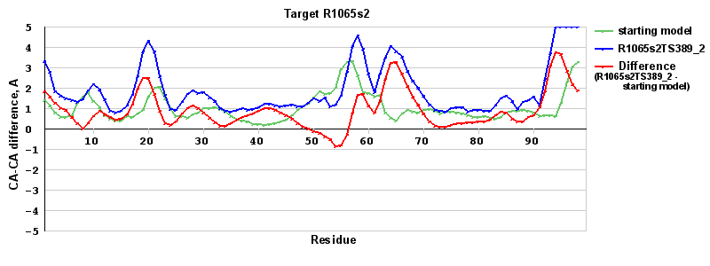 | Red line = (blue line) - (green thick line): difference between the corresponding Refined Model-Target and Starting Model-Target CA-CA distances (see above). Negative values show regions where the reifned model has better fit to the target than the starting model, i.e. areas of potential improvement. |