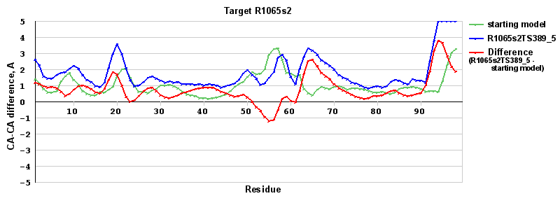 | Red line = (blue line) - (green thick line): difference between the corresponding Refined Model-Target and Starting Model-Target CA-CA distances (see above). Negative values show regions where the reifned model has better fit to the target than the starting model, i.e. areas of potential improvement. |