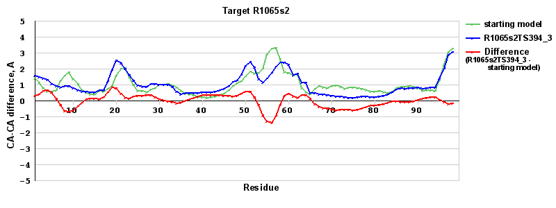 | Red line = (blue line) - (green thick line): difference between the corresponding Refined Model-Target and Starting Model-Target CA-CA distances (see above). Negative values show regions where the reifned model has better fit to the target than the starting model, i.e. areas of potential improvement. |
